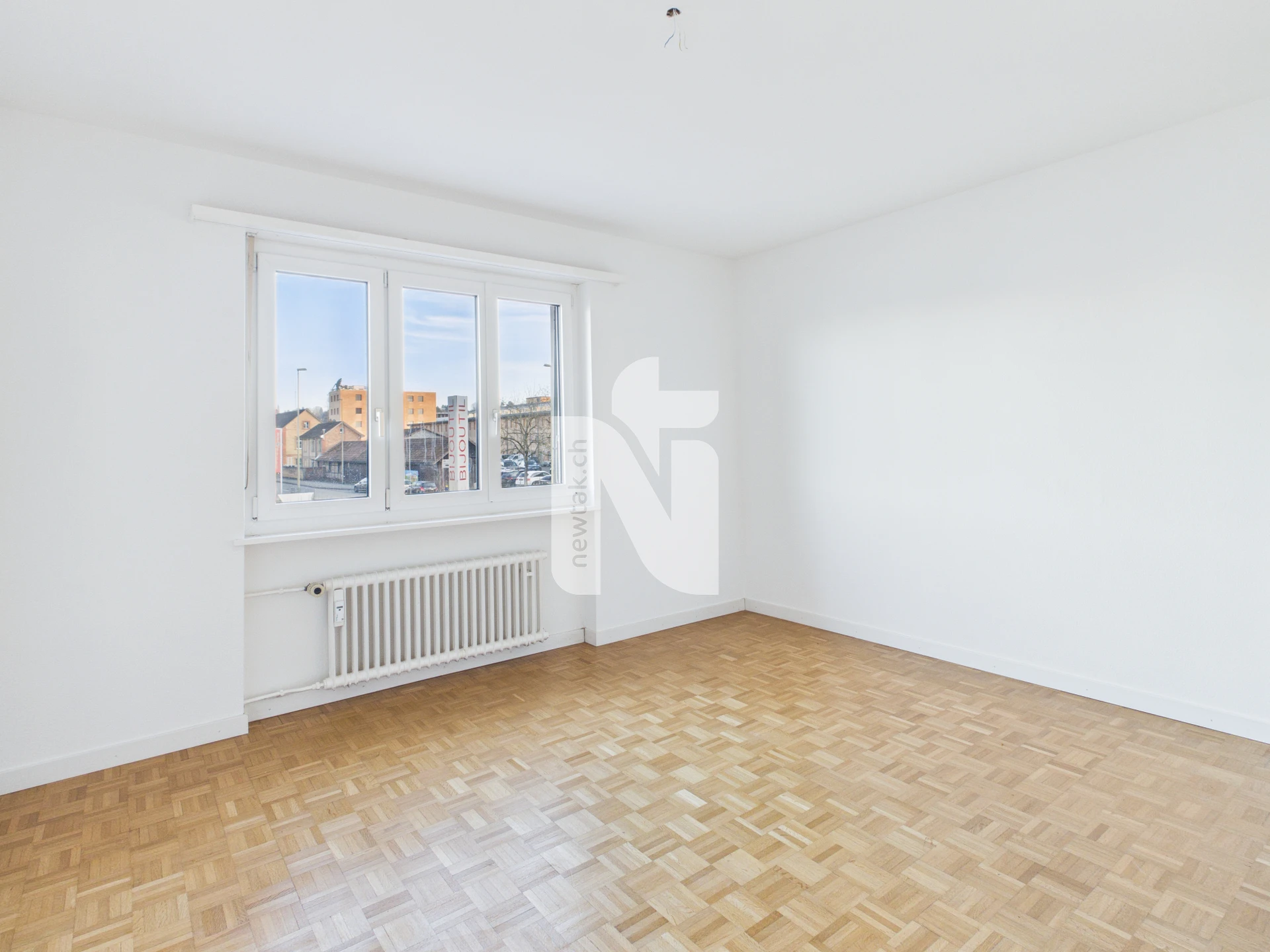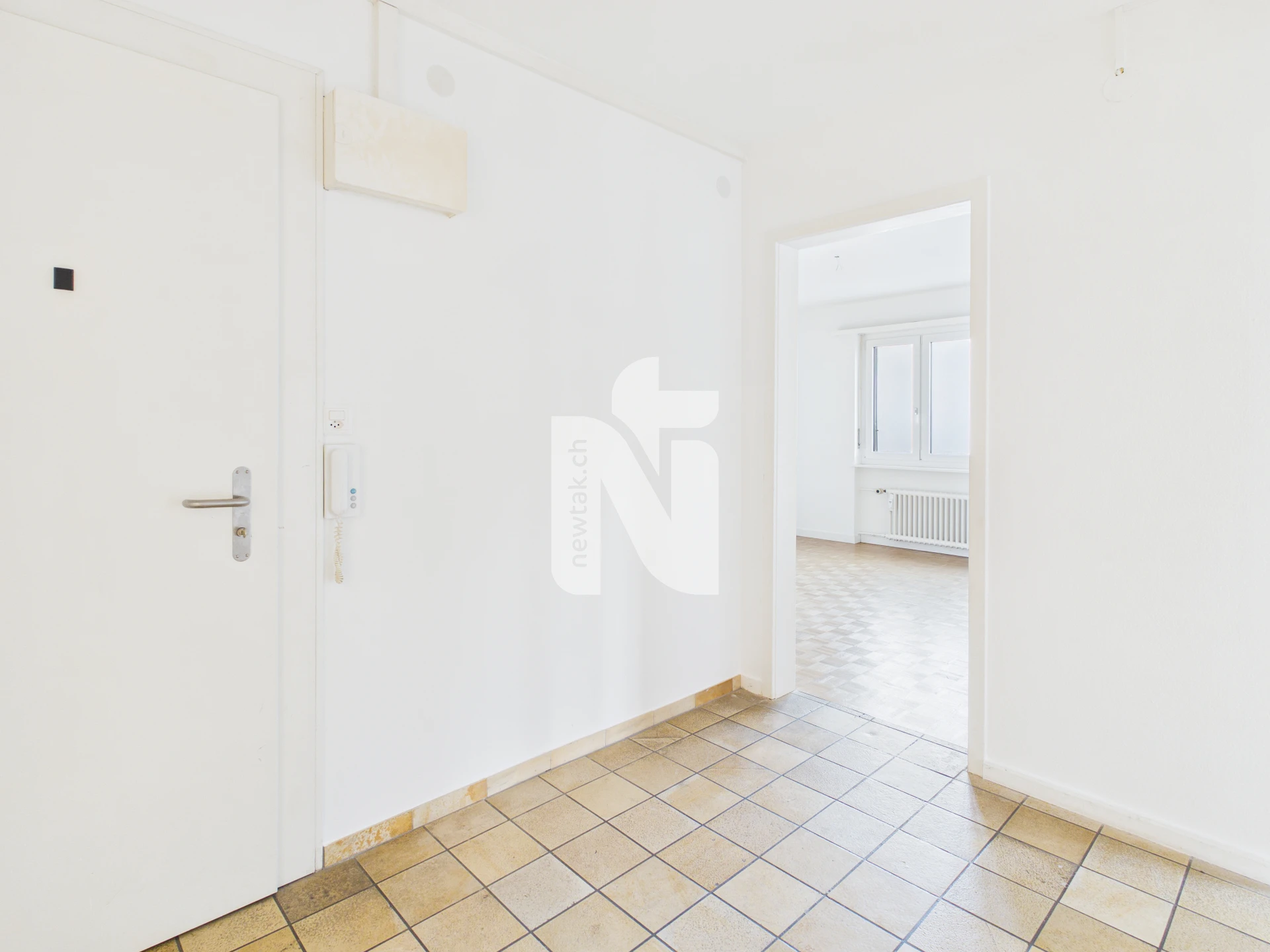 Der grosszügige Eingangsbereich mit Plattenboden und praktischem Einbauschrank bietet viel Platz für eine Garderobe. Das lichtdurchflutete Wohnzimmer mit direktem Zugang zum Balkon lädt zu entspannten Stunden ein. Zwei weitere Zimmer eignen sich ideal als Schlaf-, Arbeits- oder Gästezimmer.