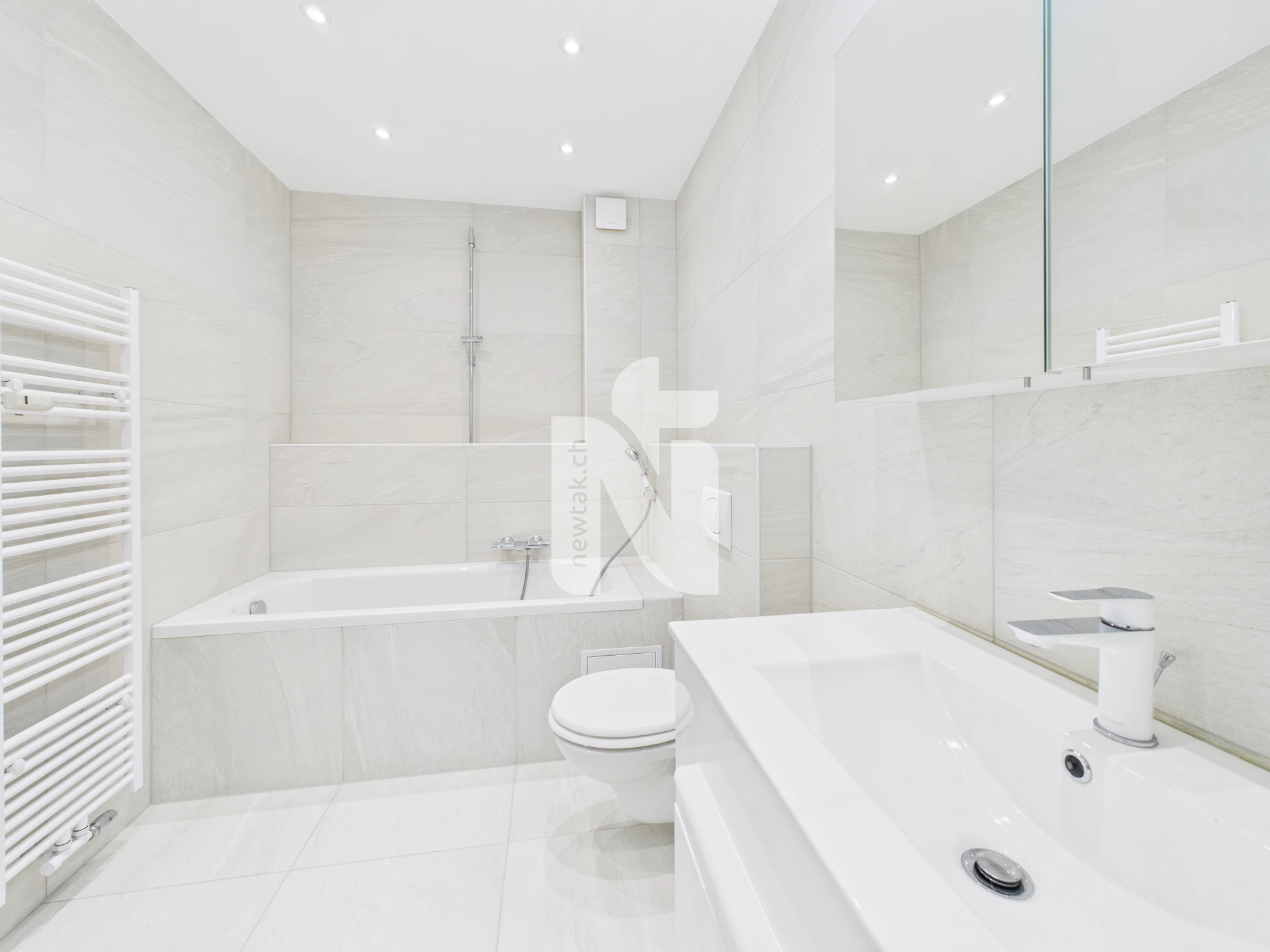 Im Badezimmer befinden sich eine Badewanne und ein praktischer Waschturm. Das Schlafzimmer bietet zusätzlich ein begehbares Kleiderzimmer mit viel Stauraum. In der ganzen Wohnung wurden feuersichere Türen eingebaut, was zusätzlichen Schutz gewährleistet.