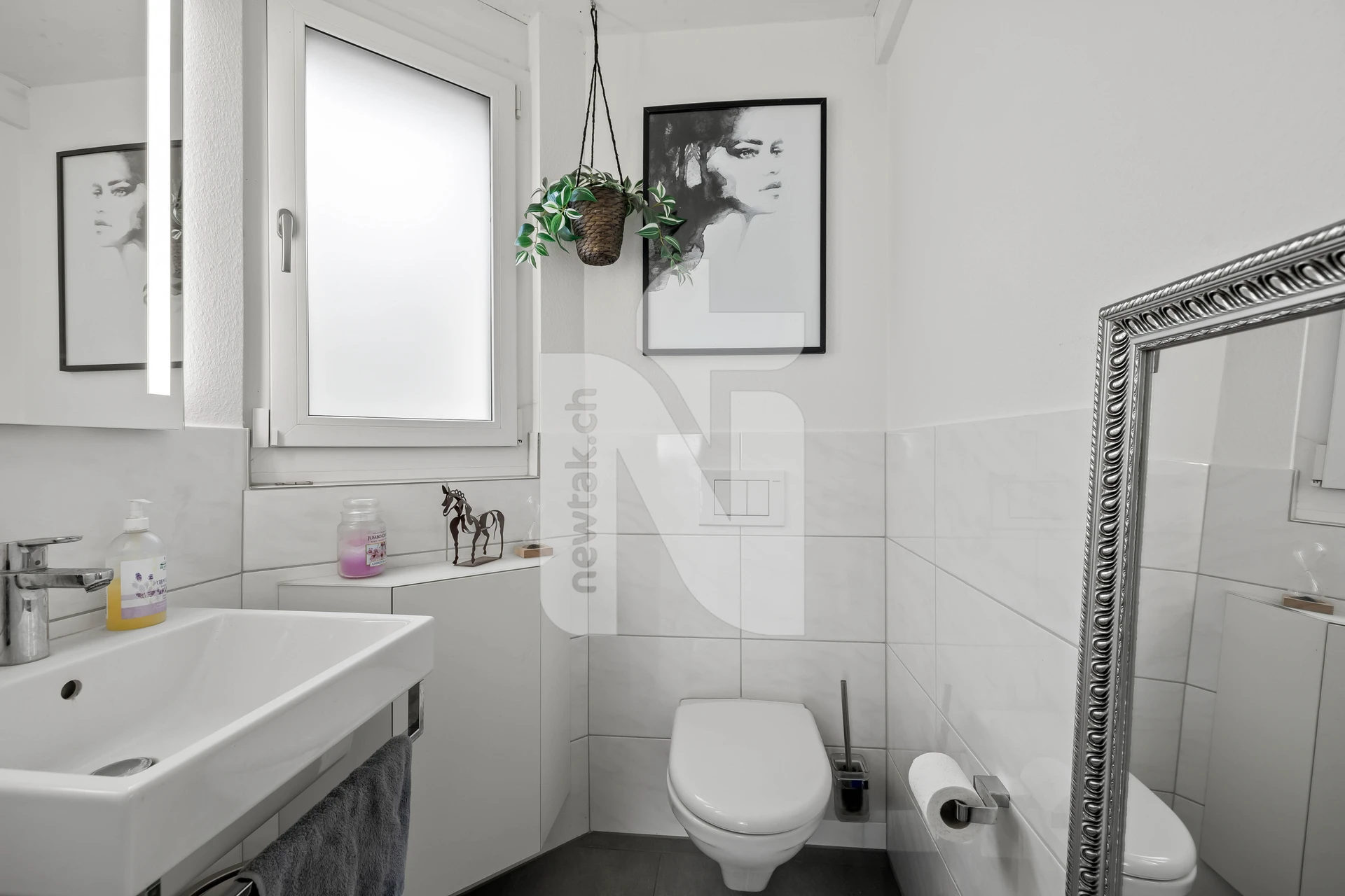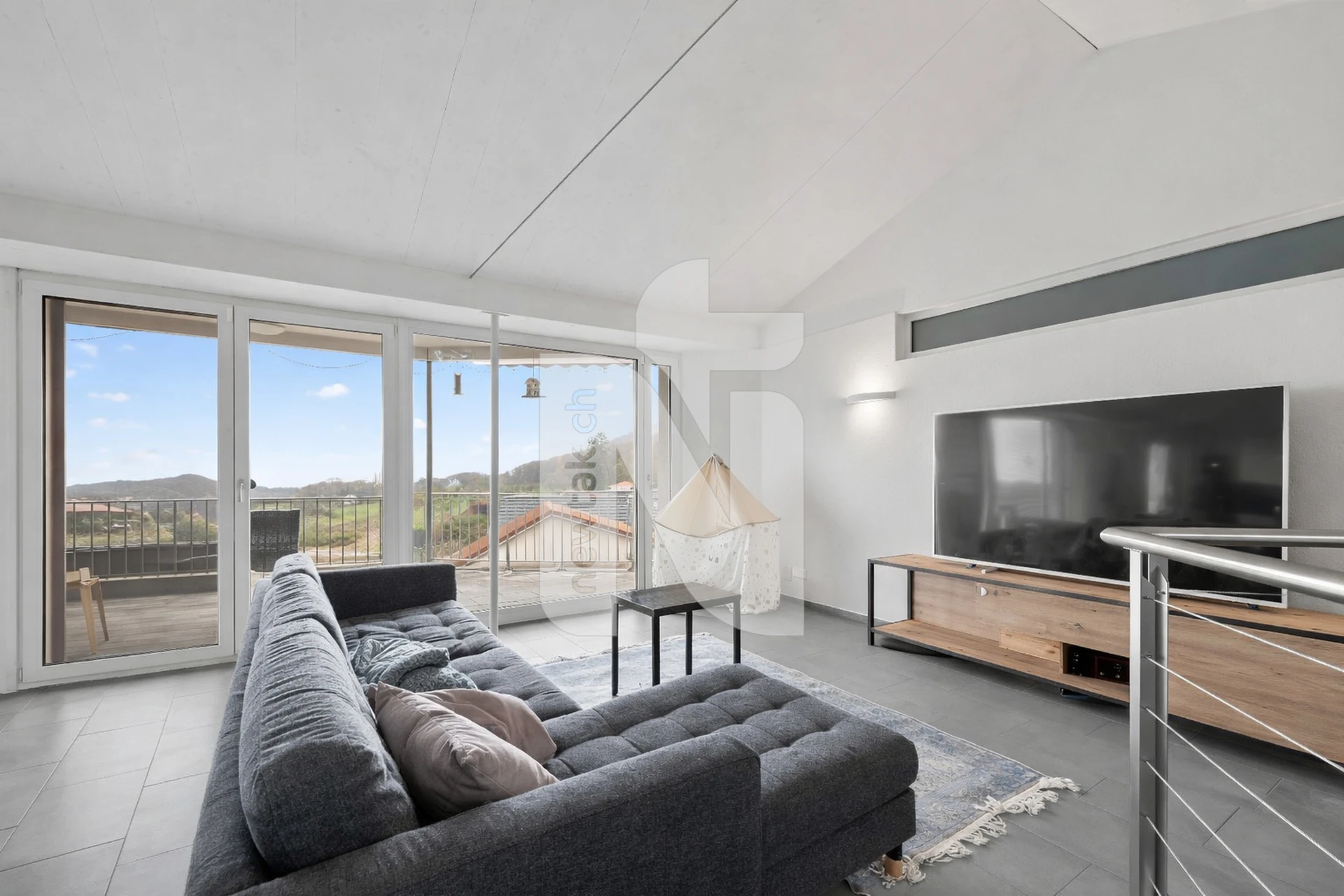 Der Eingangsbereich verfügt über ein separates Gäste-WC mit Fenster. Der grosse, offene Wohnbereich mit moderner Küche bietet direkten Zugang zum Balkon, von dem man den Weitblick und den eigenen Garten geniessen kann.