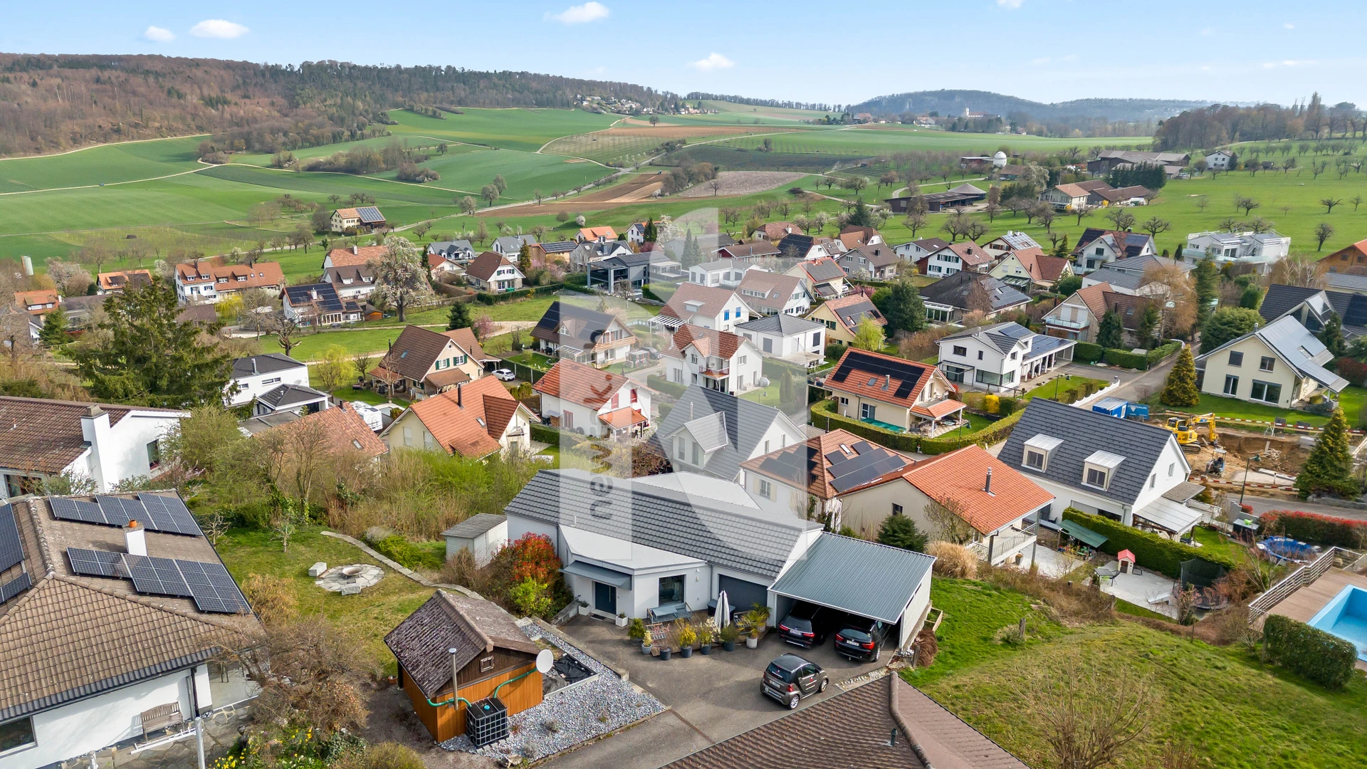 Ein Wasch- und Technikraum mit Wärmepumpe ergänzt die praktische Ausstattung und in allen Räumen sorgt die Fussbodenheizung für angenehme Wärme. Der Garten bietet zudem ein Gartenhäuschen, während vor dem Haus zwei Aussenparkplätze (Carport), ein separates Reduit und eine Garagenbox vorhanden sind.