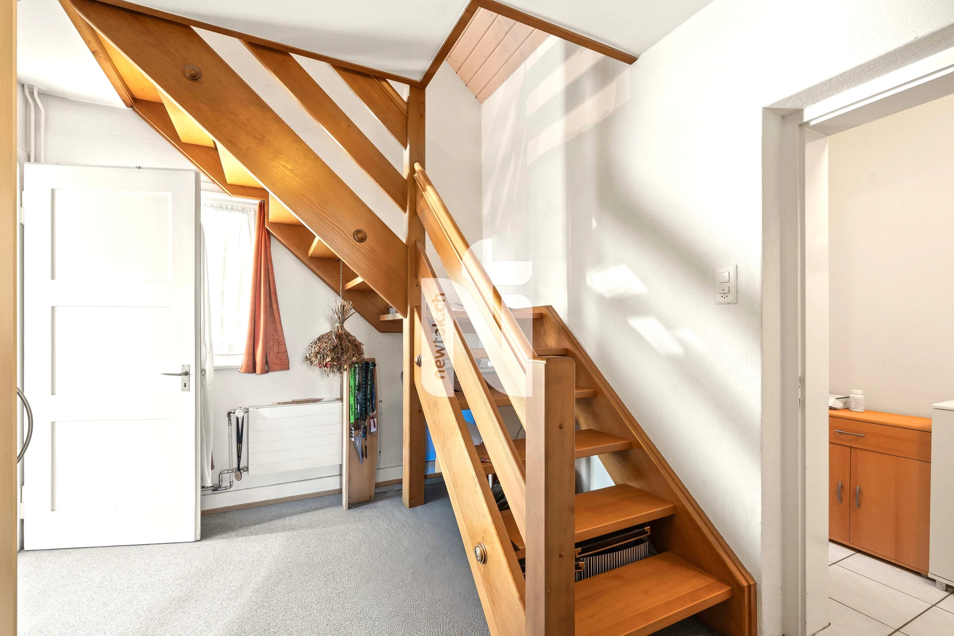 Praktische Einbauschränke im Eingangsbereich bieten zusätzlichen Stauraum. Vom Erdgeschoss gelangen Sie in den Technikraum, sowie in den zweistöckigen Schopf mit viel Potenzial und mit Zugang zum kleinen, pflegeleichten Garten.